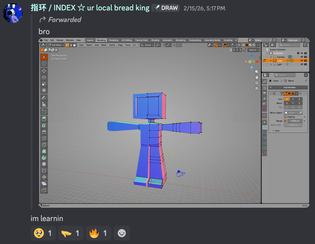 I had to stop working on the model because of New Years' custom stuff and also preparing for a trip (I was being dragged outside a lot). Also had to put aside some time to write this log, but all in all it was a promising start. Blender is unironically a ton of fun and you should totally also learn it, if only to fuck around. Yes, you, dear reader. If you're any bit interested in 3D modelling you should try to play with Blender. I encourage the making of things as recreation >:3.