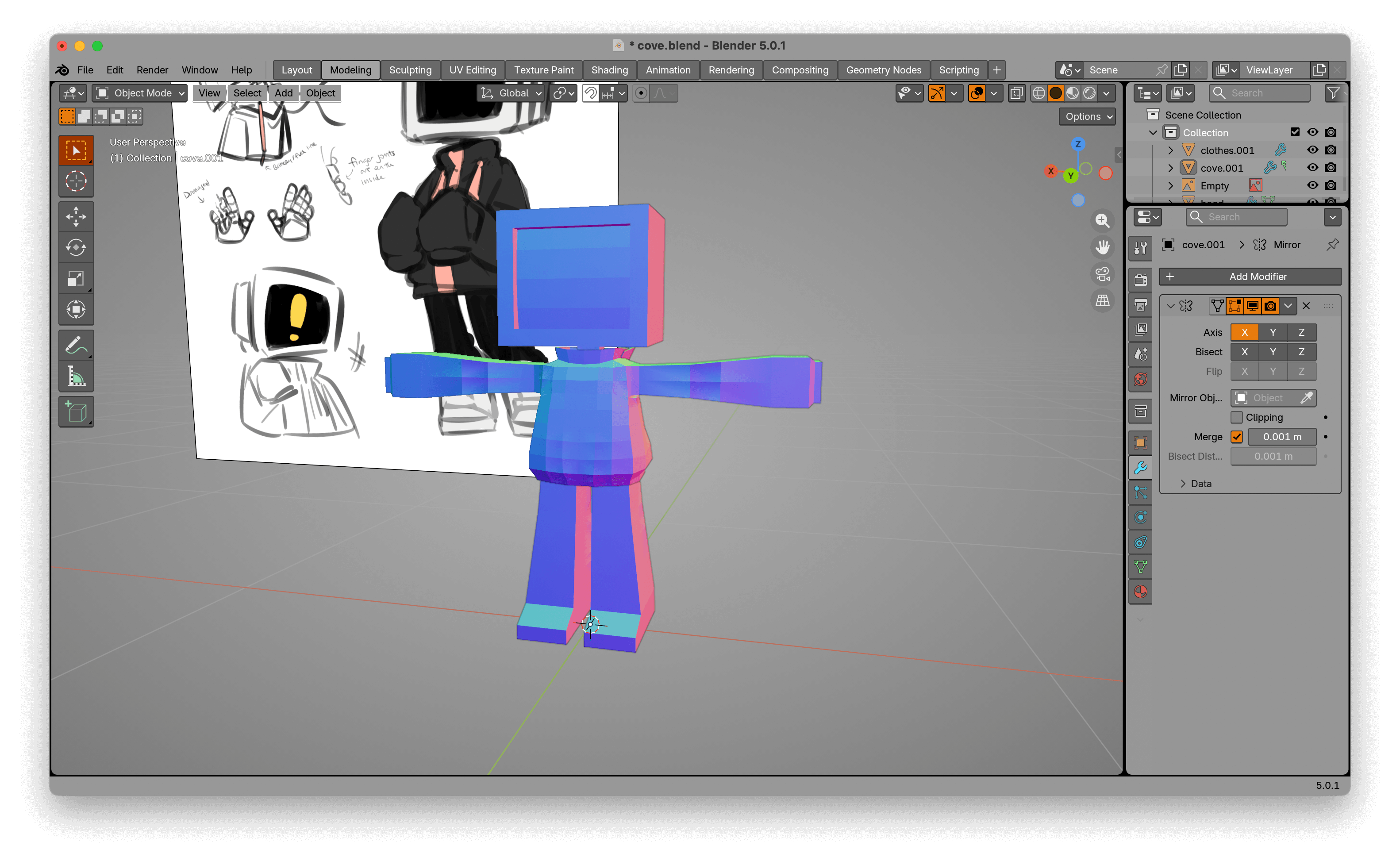 I made some changes to the connection between the hood and the collar, and then it was time to make the clothes a part of the main body. Since this was low poly I figured I should get rid of anything you can't see from the outside, i.e. connect the arms (which I directly made to be sleeves) to the hoodie's torso part, making the hoodie, and deleting the middle part of the torso. I rushed this in the final few minutes of the stream because I had to leave real soon, and it was fine, really. Not as hard as I thought it'd be. Also learned about more Blender hotkeys I need to burn into my mind in the future.