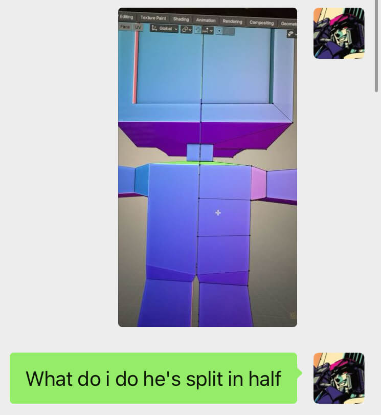 She told me to turn on "something called snapping or clipping", and I just did not see the second part of that message I guess, and instead turned on a random function that was something like snap to grid before moving the two halves back together. Which is great, until I discovered I fucked up a second time: