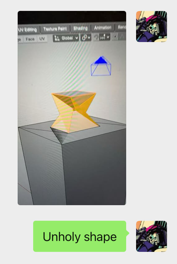 Some time after I'd finished drawing, started rigging, and given up rigging the third, I designed my current non-human sona, which you can currently see in my about page and also my gallery I guess. Since I hated the model I had now and I really didn't want to draw that sona a third time, I thought I'd try to model the current sona instead. I brought this up in conversation one day while talking to my wonderful and talented friend Debbie (SHAMELESS PLUG go check out her website!!) and she told me it'll be much easier to make a 3D model of that sona since it's basically just made out of basic geometric shapes.